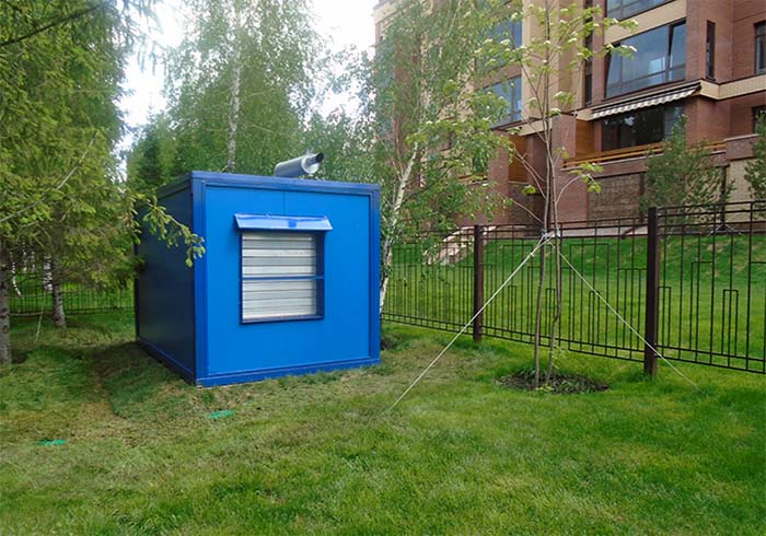 Расстояние измерения: 10 м от крайних точек блок-контейнера, на открытой площадке в четырех точках. Посторонние источники шума исключены, уровень фонового шума 42 дБА.